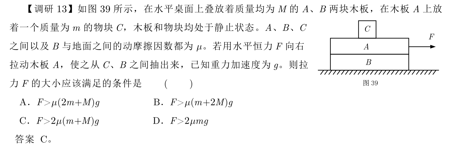 假设拉力从零逐渐增大,各接触面将依次达到最大静摩擦力并发生相对滑动。解题时必须判断哪个接触面先滑动,这取决于各接触面的最大静摩擦力和各物块的质量分布。